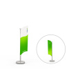 The table banner with concave lower edge is a modern and decorative advertising tool for tables and counters. The two-ply version with insert allows the front and back to be designed either the same or differently. A transparent seam provides a high-quality look, and two loops allow for easy suspension.
