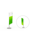 The table banner with angled lower edge creates a dynamic and eye-catching presentation on tables and counters. Its two-ply version with insert allows either identical or different designs on the front and back. A transparent seam provides a premium appearance, while two loops ensure easy suspension.