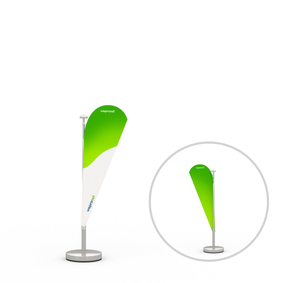 The table banner in drop shape stands out with its unique form and ensures an elegant presentation on tables and counters. Its two-ply version with insert allows either identical or different designs on the front and back. A transparent seam provides a refined look, while two loops make suspension easy.