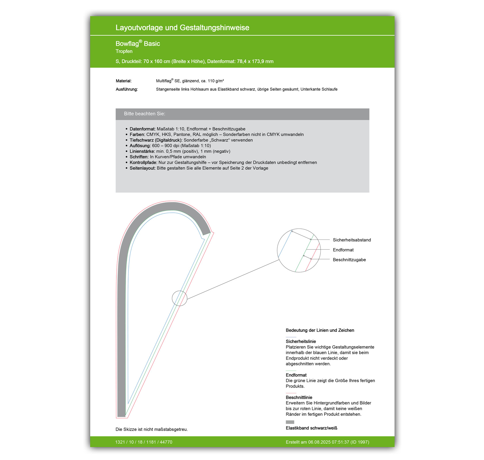 - Page 1: all important specifications for an optimal print result, as well as a product sketch with design instructions