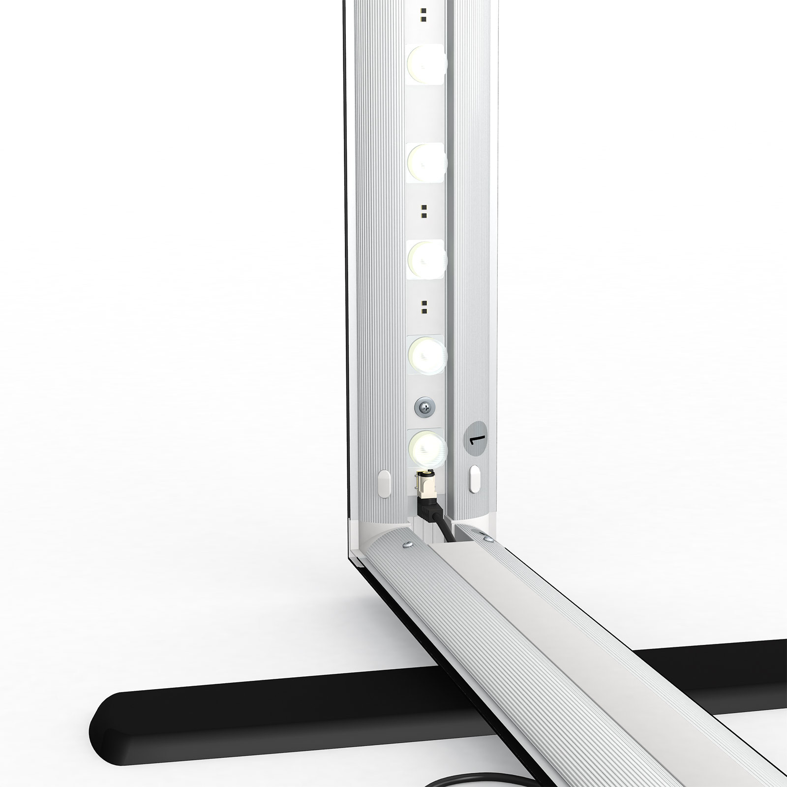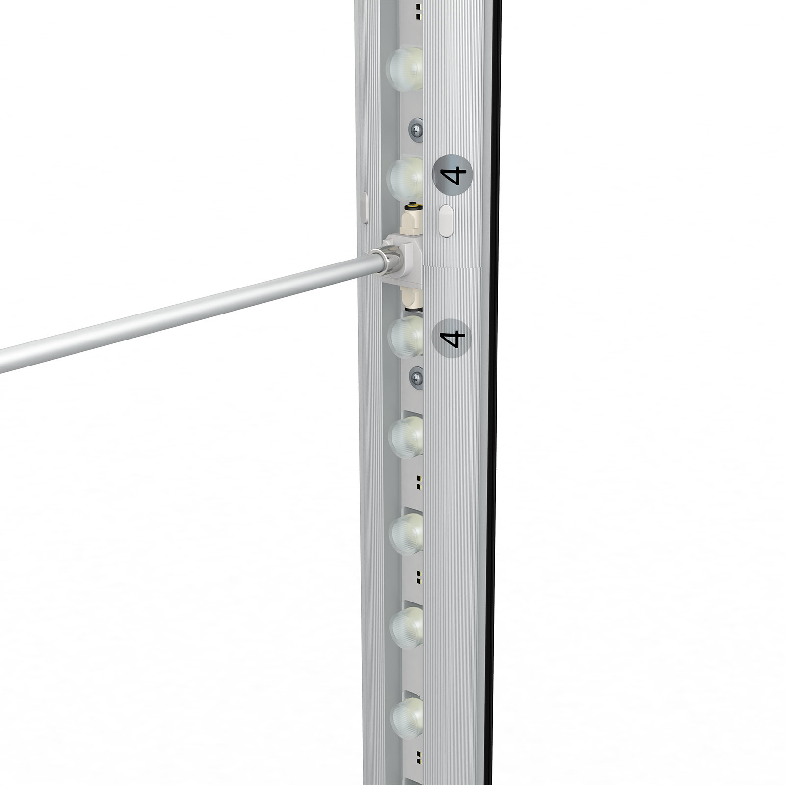 High‑impact LED trade show wall with click system and elegant black frame: This innovative system combines lightweight aluminum frames with energy‑efficient LED lighting and tightly tensioned textile prints. Thanks to integrated magnets, multiple walls can be flexibly connected into straight or angled exhibit stands.