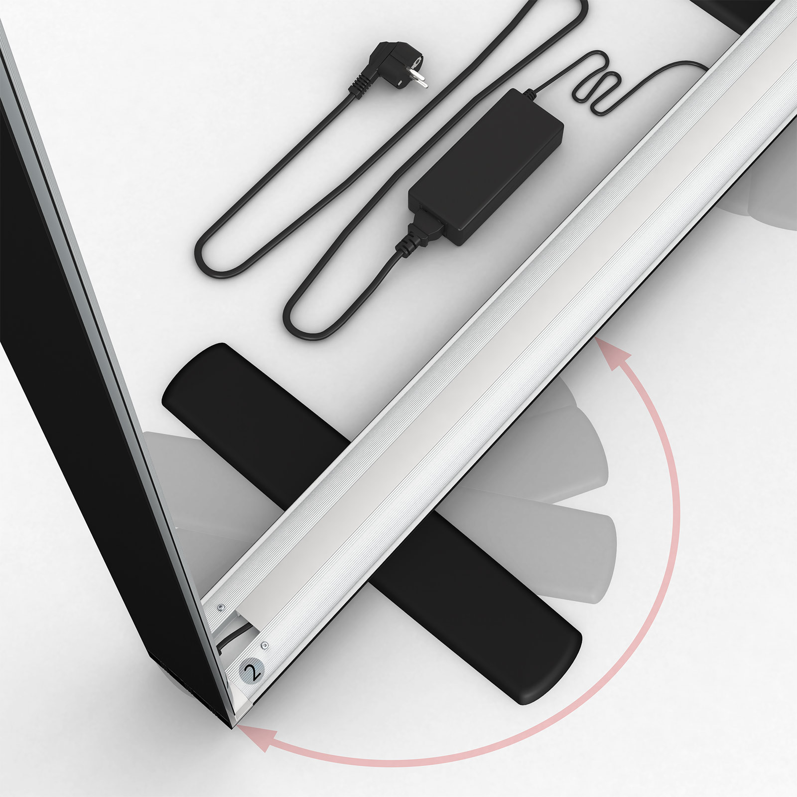 - Tool‑free assembly: align feet, connect frame elements via click system, insert support bar, connect power — done