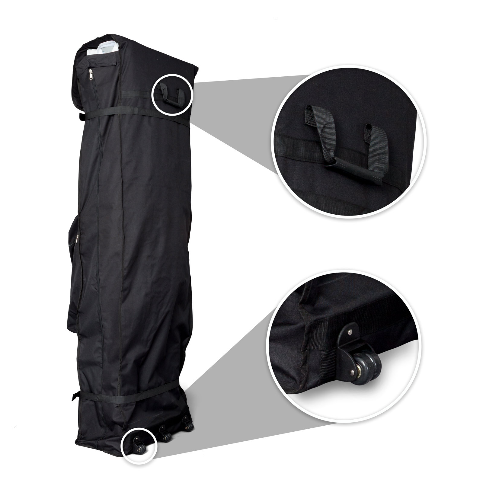 Note: To avoid damage to the product, the tent frame must be placed with its feet down in the trolley bag Basic and then carefully tensioned with the straps. The Trolley Bag Basic is suitable for the storage as well as the occasional, short transport of folding tents on smooth floors.